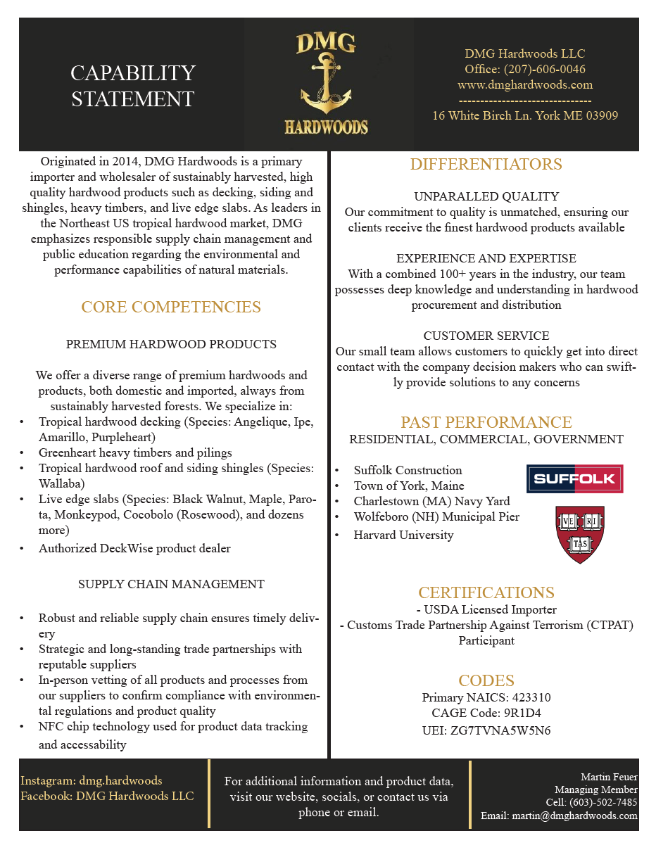 Today, DMG Hardwoods is primarily an importer of exotic wood decking from South America and West Africa. In addition to decking, DMG also carries various wood species of Live Edge Slabs.